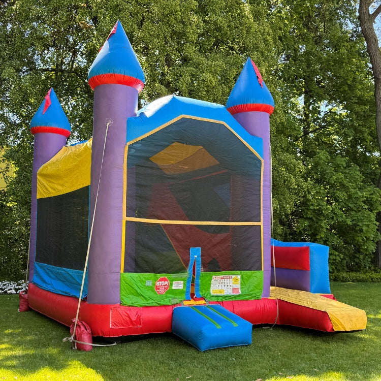 Here Ye, Here Ye! All princes and princesses in the kingdom are hereby summoned to join in the boundless fun of the Castle 5 in 1 Bounce House Combo. This inflatable rental has a bouncing area, climbing wall, slide, two basketball hoops, and entanglement game. It's a Blue Apple favorite fit for royalty.